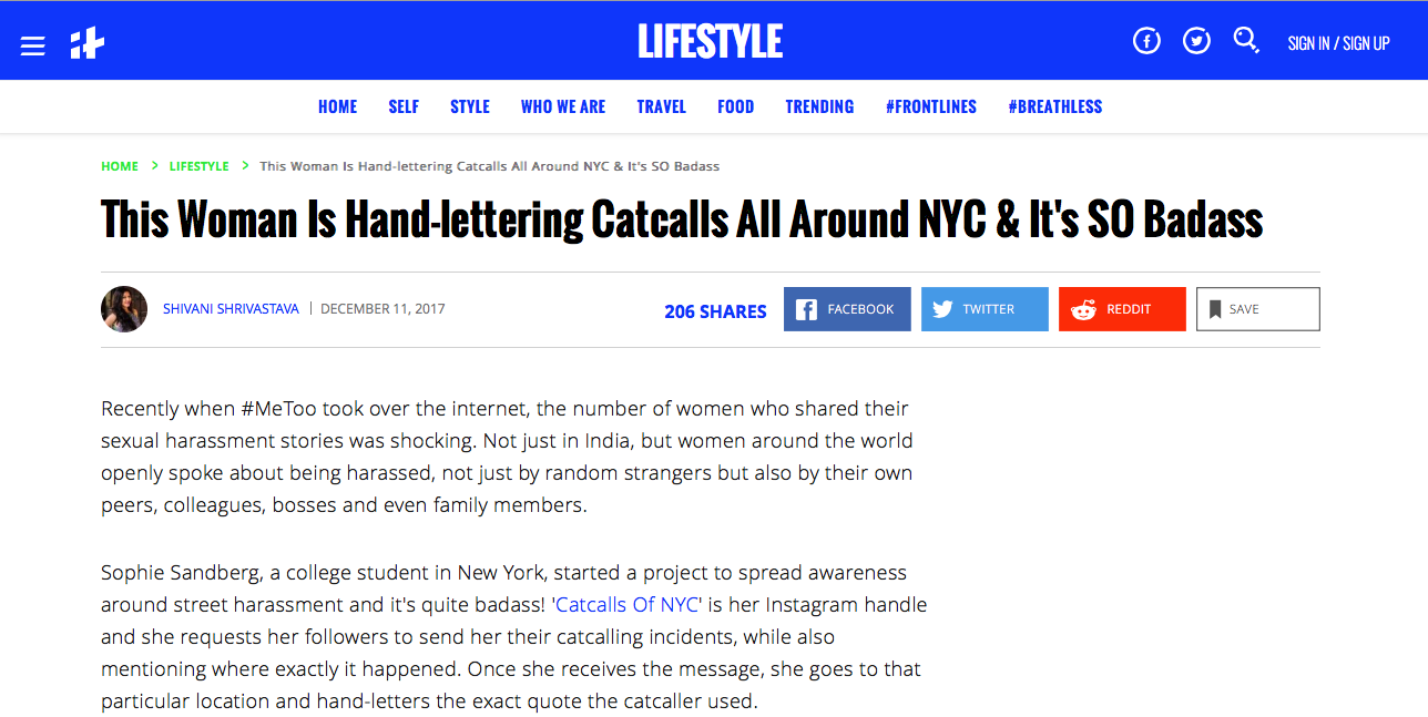 "Sophie Sandberg, a college student in New York, started a project to spread awareness around street harassment and it's quite badass! 'Catcalls Of NYC' is her Instagram handle and she requests her followers to send her their catcalling incidents, while also mentioning where exactly it happened. Once she receives the message, she goes to that particular location and hand-letters the exact quote the catcaller used."